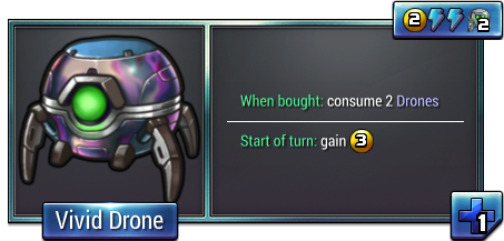 Even counting that they cost 2 energy, Vivid Drones are much more efficient than standard Drones. This doesn't mean you should open with Vivids on your first turn, however: in the early game it is more important to buy multiple income per turn than to save a few gold. The exception is if you want to go for an extremely low-economy opening and get technology on turn 1 or 2 without wasting energy.